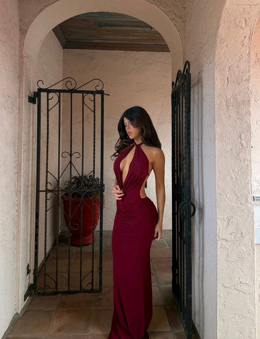 ❤️ Maroon Cut-Out Halter Gown Step into elegance with this stunning maroon gown designed to make a bold, unforgettable statement. Featuring a sultry halter neckline and a dramatic deep draped front, this dress beautifully enhances your silhouette while adding a touch of luxury. The side cut-out detail adds just the...
