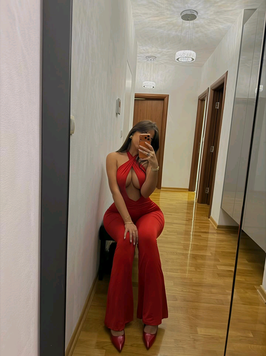 Backless Flare Jumpsuit 🔥 Make a bold entrance in this statement red jumpsuit designed to hug and highlight your curves from every angle. The halter neckline flows into a stunning open-back design, giving it that irresistible, head-turning finish. Crafted from a smooth, stretchy fabric, it offers a sculpted fit while...