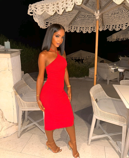 Scarlet Cut-Out Gown ❤️ Turn heads the moment you walk in. This statement red gown is designed to command attention with its bold front cut-out and sleek, body-contouring fit. The high neckline paired with long sleeves gives it a sophisticated edge, while the daring silhouette adds just the right amount...