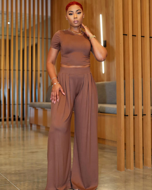 ✨ Two-Piece Wide-Leg Lounge Set (Chocolate Brown) Elevate your everyday style with this rich, earthy set 🤎—effortlessly classy and flattering. ✨ Details: Fitted short-sleeve crop top for a clean, sculpted look High-waisted wide-leg pants with a soft, flowing silhouette Smooth, stretchy fabric that hugs comfortably without feeling tight Elegant drape...