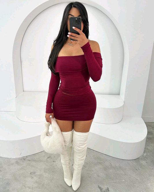 ✨ Off-Shoulder Mini Skirt Set (Maroon) ❤️🔥 Bold, sleek, and effortlessly sexy — this maroon two-piece set is designed to accentuate your curves while keeping you classy and confident. ✨ Details: Chic off-shoulder long sleeve top for a flattering neckline Matching high-waisted mini skirt that hugs your figure Smooth, soft...
