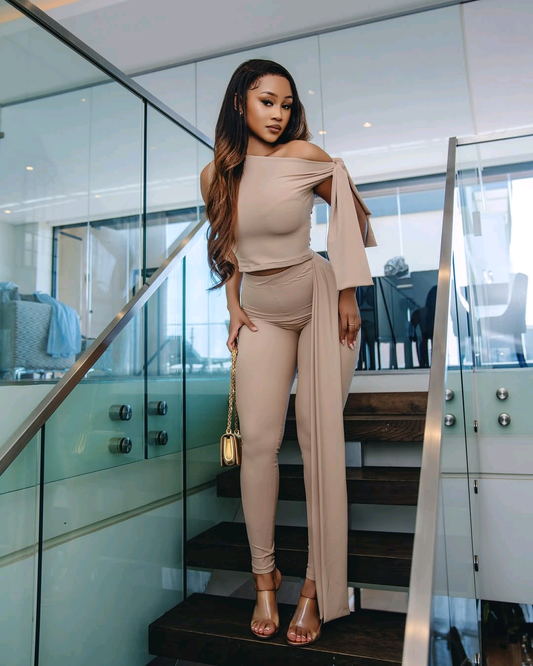 Beige Luxe Draped SetWhere Comfort Meets Statement Elegance Elevate your style with this stunning beige two-piece set designed to sculpt and flatter your curves. The off-shoulder top features a soft draped sleeve detail that adds a touch of drama and femininity, while the fitted high-waisted leggings create a sleek, elongated...