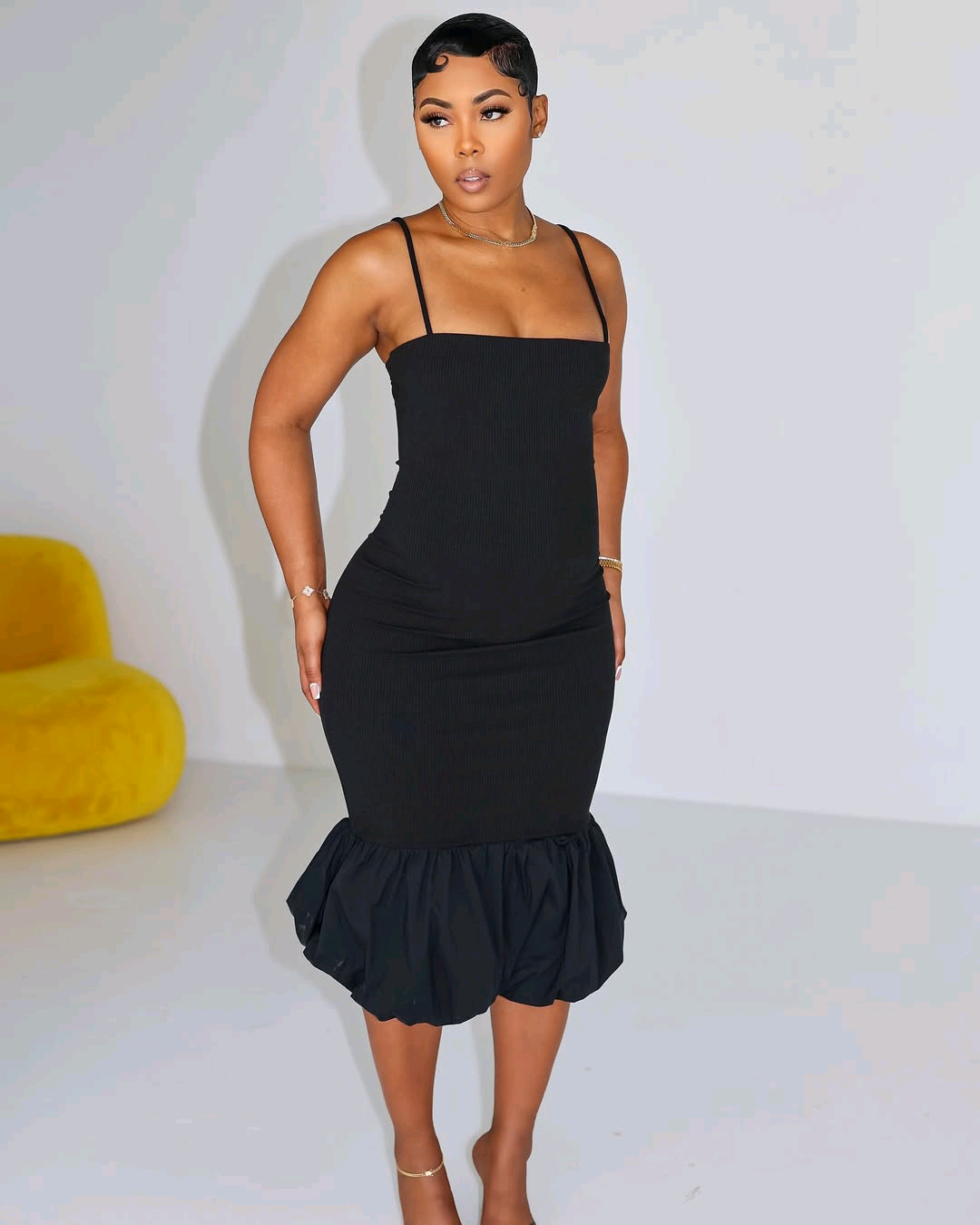 🖤 Black Ribbed Midi Dress with Ruffle Hem